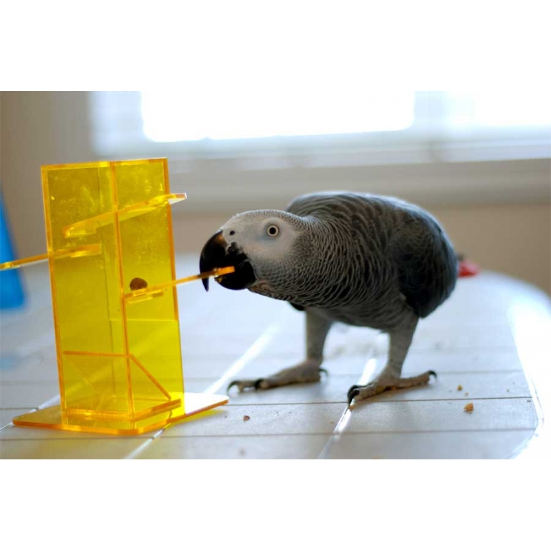 This Large Birdie Plunk Puzzle Tower has been designed to keep your Parrot entertained. The colored see-through acrylic allows your Parrot to see the reward you have placed inside. They just need to work out how to make it fall to the opening at the bottom. Place a treat in the top compartment and, one by one, your bird has to pull the levels until the treat falls down to the bottom compartment where they can retrieve their prize.