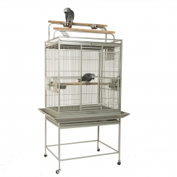 This is a large, Raised Base parrot cage for medium parrots including African Greys and Amazons, it Features a large opening from the door, a multi-leveled play top, and a removable tray and grill that are raised off the ground for easy access and cleaning.