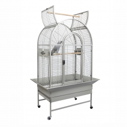 This cage is suitable for Medium Parrots, e.g. African Greys and other similar-sized birds. It features a design that opens into an open-top cage, seed catcher, castors, pull-out cleaning tray, safety grill, large swing opening the front door with a clock lock. Also includes one open-top perch, one internal perch, and three stainless steel feeding bowls.