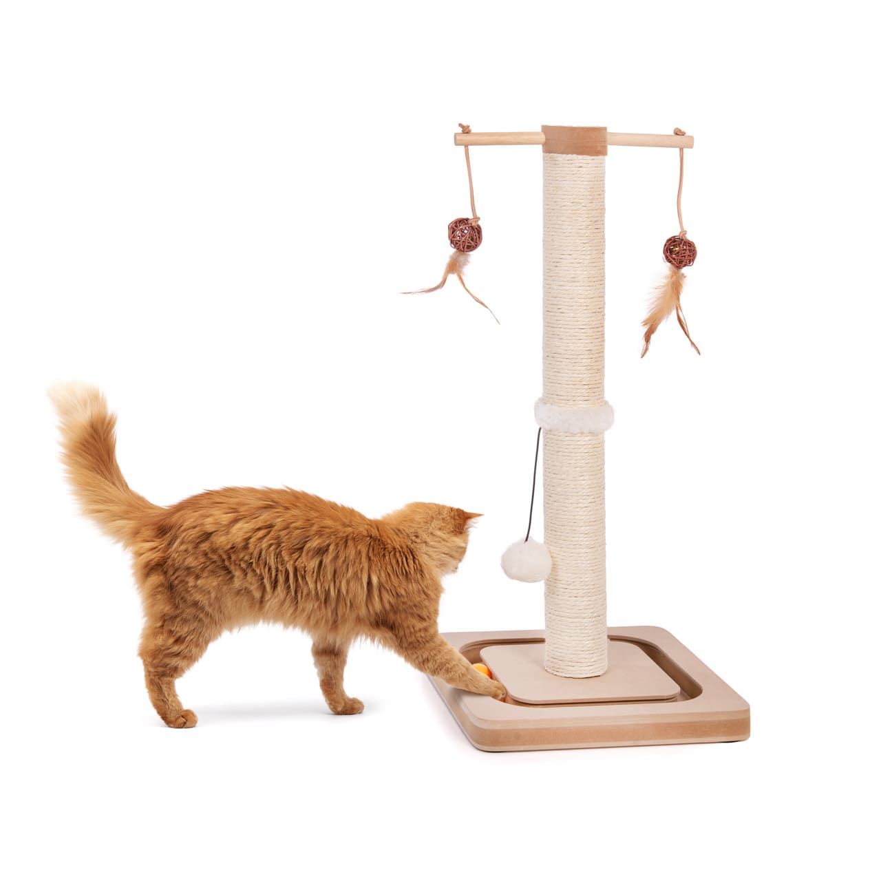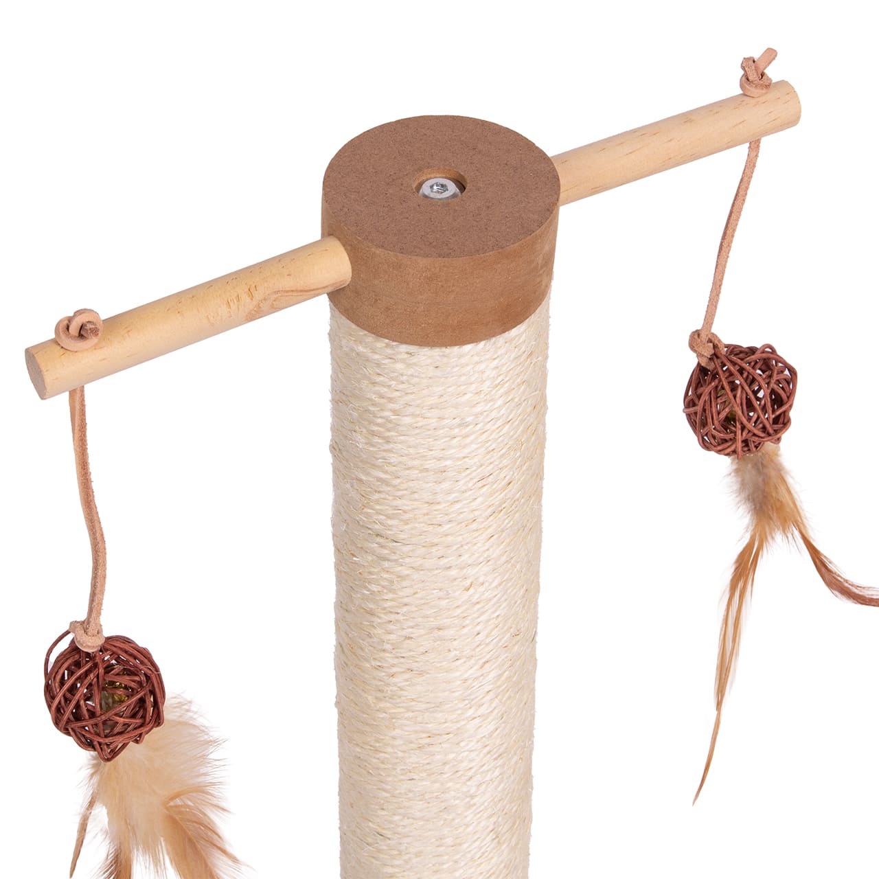 At the top of the scratching post there is a crossbar that contains two cat fishing rods with feather toys. These encourage your cat to move, jump and catch the feather toys. At the middle height of the scratching post there is another plush pompom catching toy that provides additional fun and challenge.