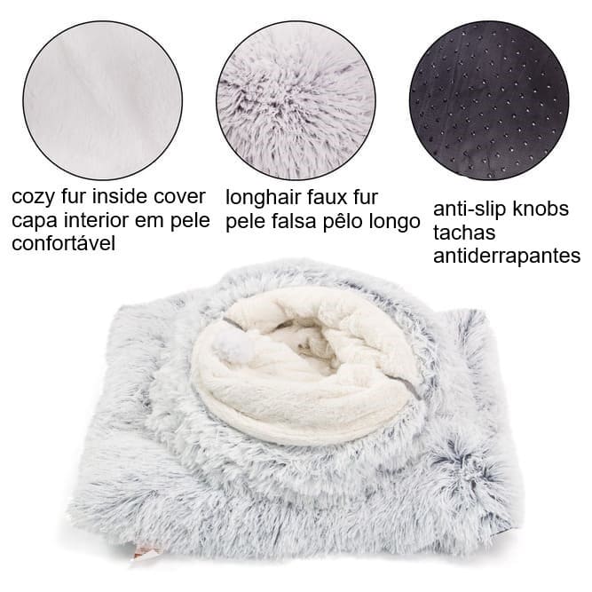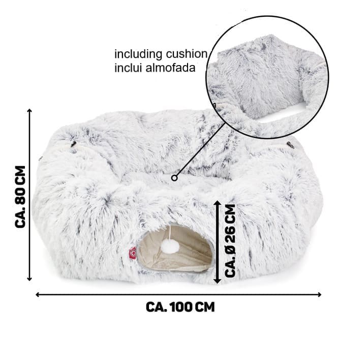 The tunnel has a large entrance hole that is equipped with a play ball and invites you to play and run around. In the middle of the tunnel there is a fluffy cushion with an anti-slip base that offers your furry friend additional comfort. The cushion can be securely attached to the tunnel with loops to keep it in place.