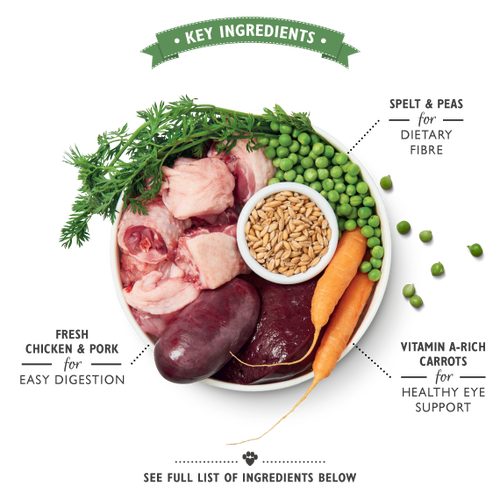 Composition: Organic Chicken (28%), Organic Pork (12%), Organic Beef (10%), Organic Fish (4%), Organic Carrots (3%), Organic Peas (3%), Organic Spelt, Vitamins, and Chelated Minerals. Herbs & botanicals: Organic Alfalfa, Organic Cleavers, Organic Kelp, Organic Spirulina. Analytical constituents. Crude Protein 9.5%, Crude Oil & Fats 6.0%, Crude Fibre 0.3%, Crude Ash 2.2%, Moisture 82.0%. Trace Elements (per kg): Zinc (as Zinc sulphate Monohydrate) 15.2 mg, Manganese (as Manganese sulphate Monohydrate) 3.2 mg, Iodine (as Calcium iodate) 0.5 mg.