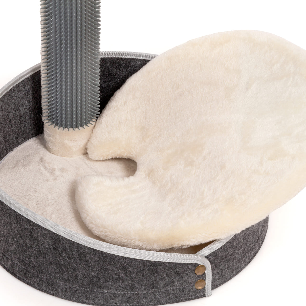 At the base of the post, you'll find a cosy bed, equipped with a soft cushion and a felt border. This bed offers your cat a comfortable and safe place to rest and observe its surroundings.