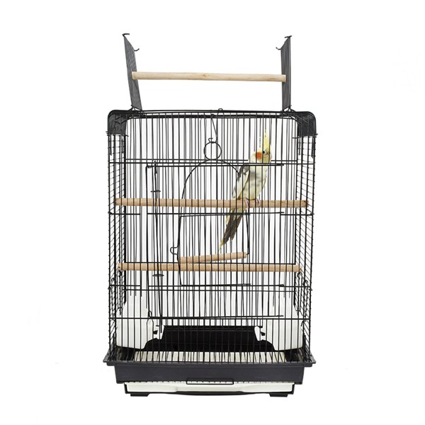 The cage is suitable for Finches, Budgies, Canaries, Cockatiels, and other similar-sized birds. The cage features a design that opens into an open-top cage, a plastic base with coated wire construction, a pull-out cleaning tray with a safety grill, two carry handles, and a small door set within a large swing opening door. The cage includes one swing, two internal perches, one external perch, and two plastic feeding bowls.