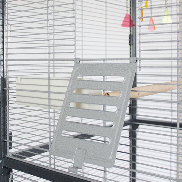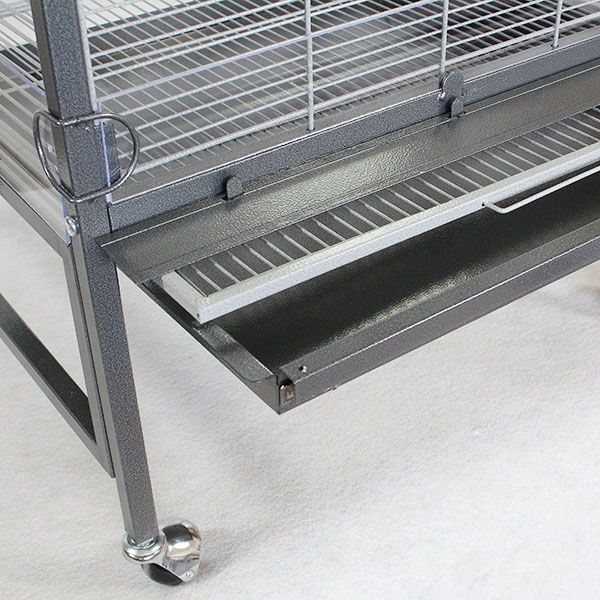 An all-acrylic splash guard at the bottom of the cage keeps the surrounding area clean. These models are additionally equipped with a slide-out grill, permitting easy cleaning while keeping the birds inside the cage.