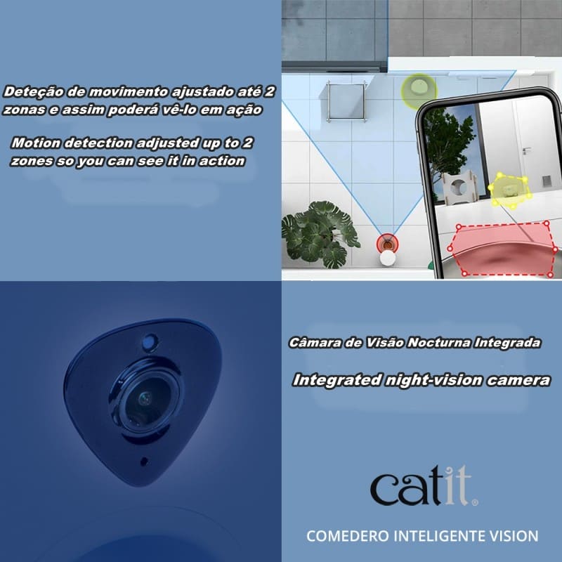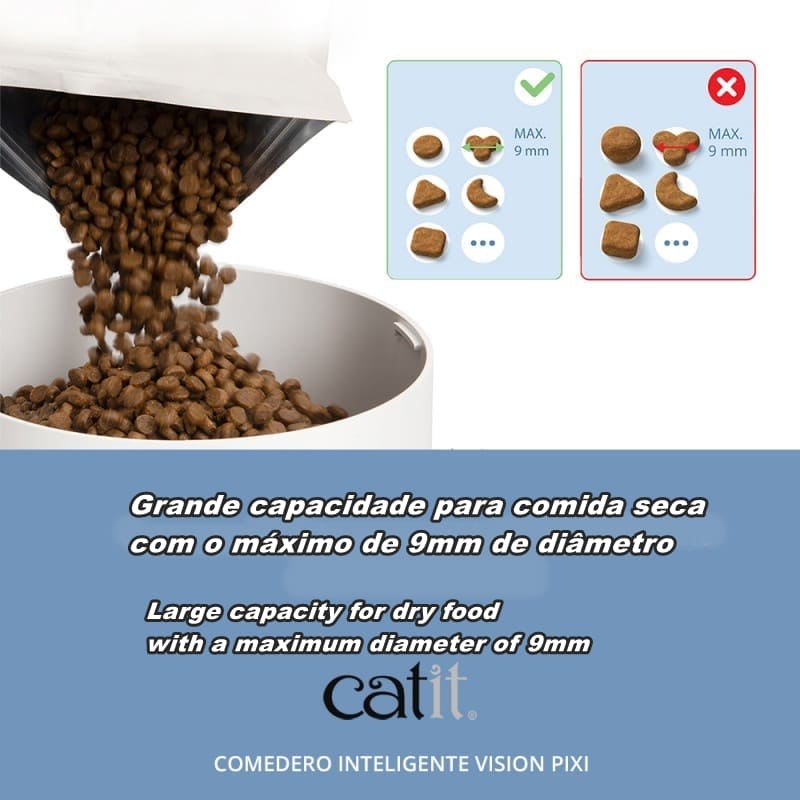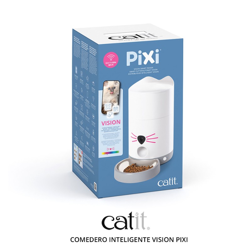 The Catit PIXI Vision Smart Feeder gives cats the right amount of food at the right time and allows the guardian to call you at mealtime, even when you are not at home. The charming, feline design of the Catit PIXI line makes this Feeder an even more decorative part of any home with cats. With the Catit PIXI mobile app, it's easy to schedule food dispensing and monitor your cat's bowl, even take photos and record videos for later viewing. Thanks to the built-in microphone and speaker, you can listen and talk to your cat live from anywhere.