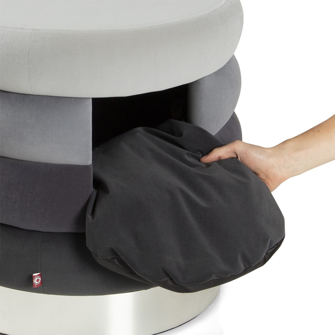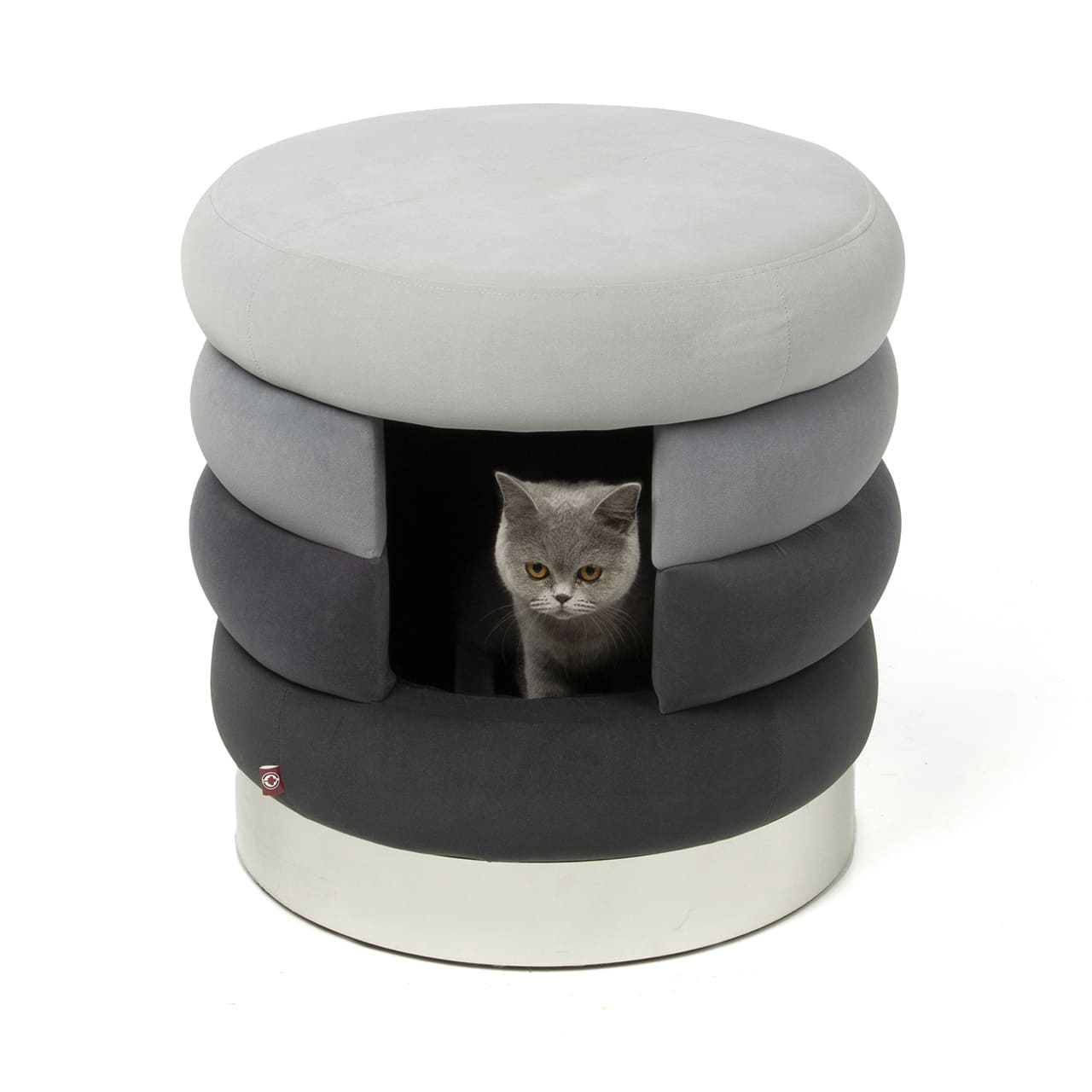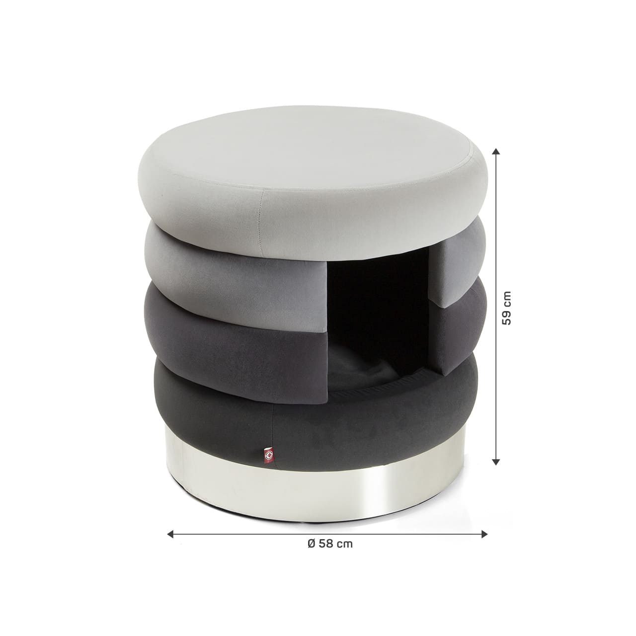 A caverna para gatos é a peça de mobiliário de luxo de design absolutamente elegante e incomparável. A cobertura é feita de tecido aveludado e macio. A parte superior almofadada do banco, que serve maravilhosamente como um posto de observação, oferece um conforto absoluto. A forma redonda é criada a partir de anéis individuais, graduados em cores e empilhados. A caverna acolhedora é rematada por uma larga faixa cromada mate à volta da cama do gato.