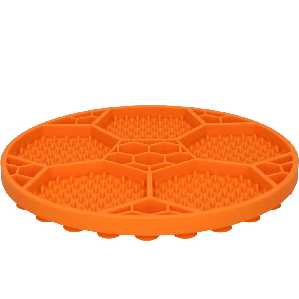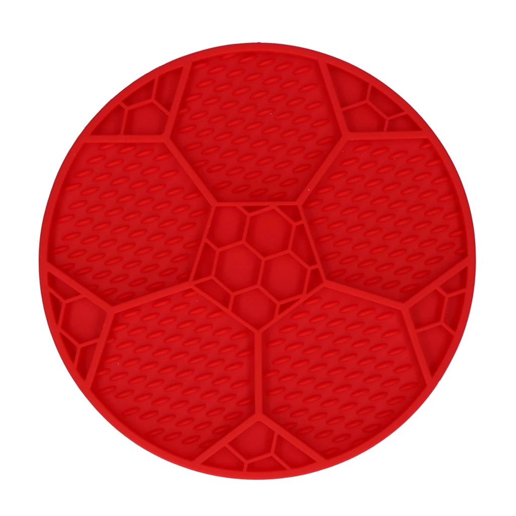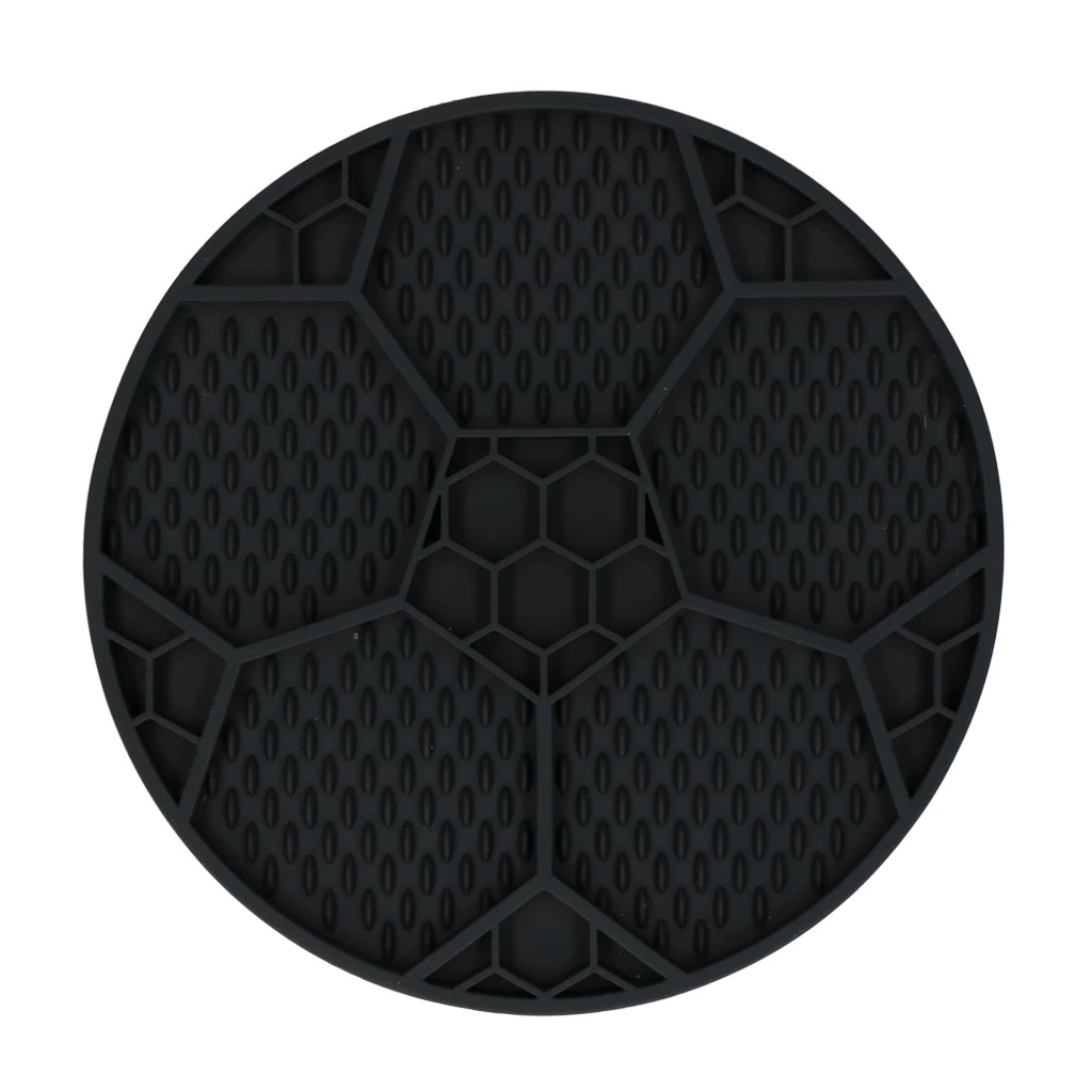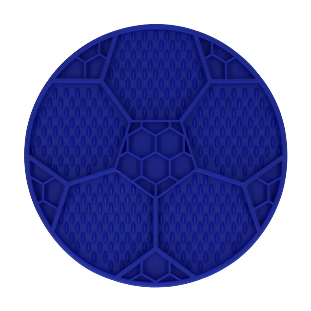 Este tapete redondo com padrão de bola de futebol torna a tarefa de lamber todas as guloseimas ainda mais desafiante! O cão ou o gato terá de se esforçar para lamber tudo nos cantos. Graças às ventosas na parte inferior, pode fixar bem o tapete a uma superfície lisa, para que não se desloque enquanto o cão ou o gato estiver a usá-lo.