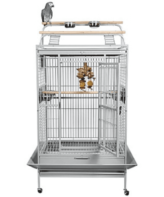 Esta gaiola é adequada para papagaios médios, por exemplo, cinzas africanos, papagaios grandes, por exemplo, araras e outras aves de tamanho semelhante. Apresenta um bonito design com o topo plano onde se encontram 2 poleiros desnivelados, apanhador de sementes, rodas, bandeja de limpeza removível, grade de segurança e porta frontal de abertura ampla com fechadura giratória. Inclui um poleiro superior, duas escadas curvas superiores, um poleiro interno, duas tigelas de alimentação em aço inoxidável e quatro tigelas de alimentação em aço inoxidável.