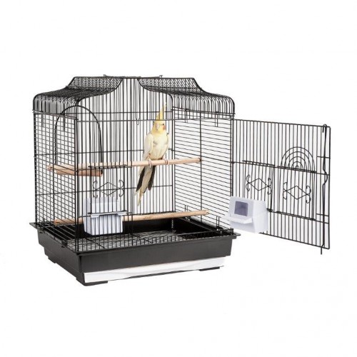 Esta gaiola é adequada para periquitos, tentilhões, canários e outras aves de tamanhos semelhantes. A gaiola possui uma base plástica com construção de arame revestido, uma bandeja de limpeza removível com grade de segurança e uma ampla porta localizada na frente da gaiola. Inclui um baloiço, um poleiro de madeira e duas tigelas de plástico.