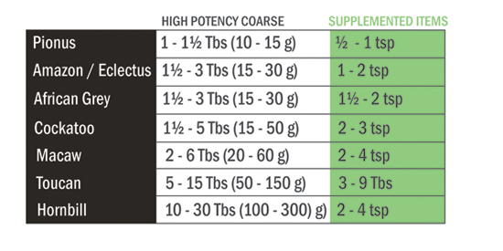 Aves de reprodução: Os pássaros devem ser alimentados com fórmula de alta energia 1-2 meses antes do período de reprodução e até que os pintos sejam desmamados ou durante pelo menos seis meses antes de retomar a fórmula de vida adulta. A quantidade de legumes e frutas orgânicos certificados suplementares pode ser aumentada até que os pintos sejam desmamados.