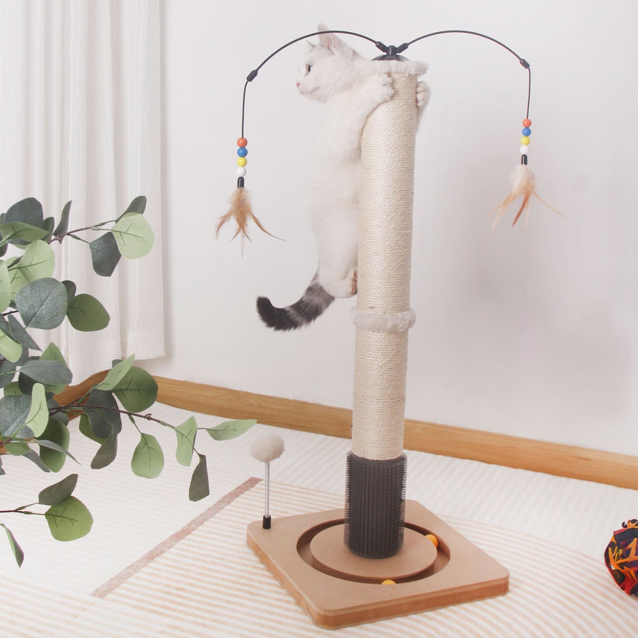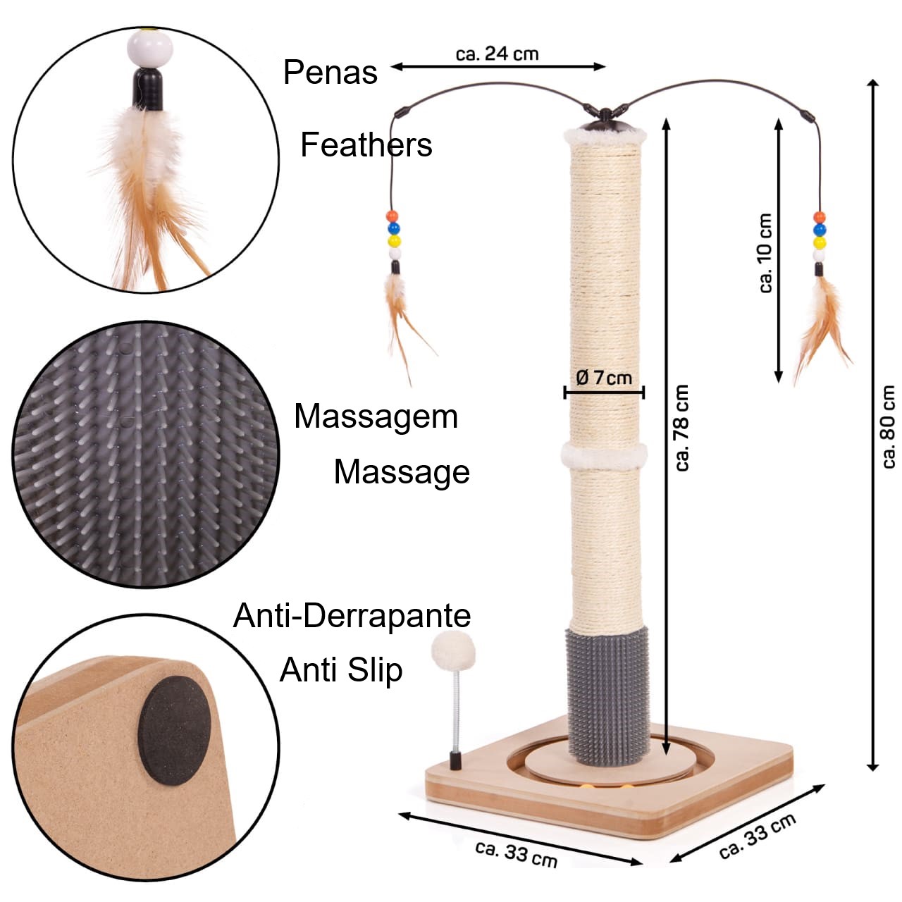 Na parte inferior do poste, há uma área de massagem com superfície semelhante a um ouriço — aqui, os gatos podem aconchegar-se ao corpo e massajar-se com prazer.