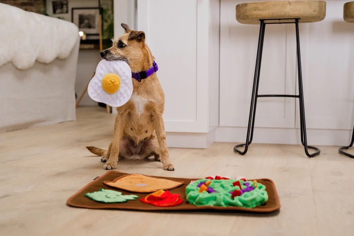 Tapete Savory Sunrise Snuffle Mat - a maneira perfeita de transformar o pequeno-almoço numa aventura saborosa para o seu cachorro! Este tapete delicioso foi concebido para encantar os sentidos do seu cão com uma mistura de tesouros escondidos e um ovo que apita e é removível. Veja o seu amigo peludo farejar as guloseimas do pequeno-almoço sob o sol da manhã, tornando cada dia um dia maravilhoso!